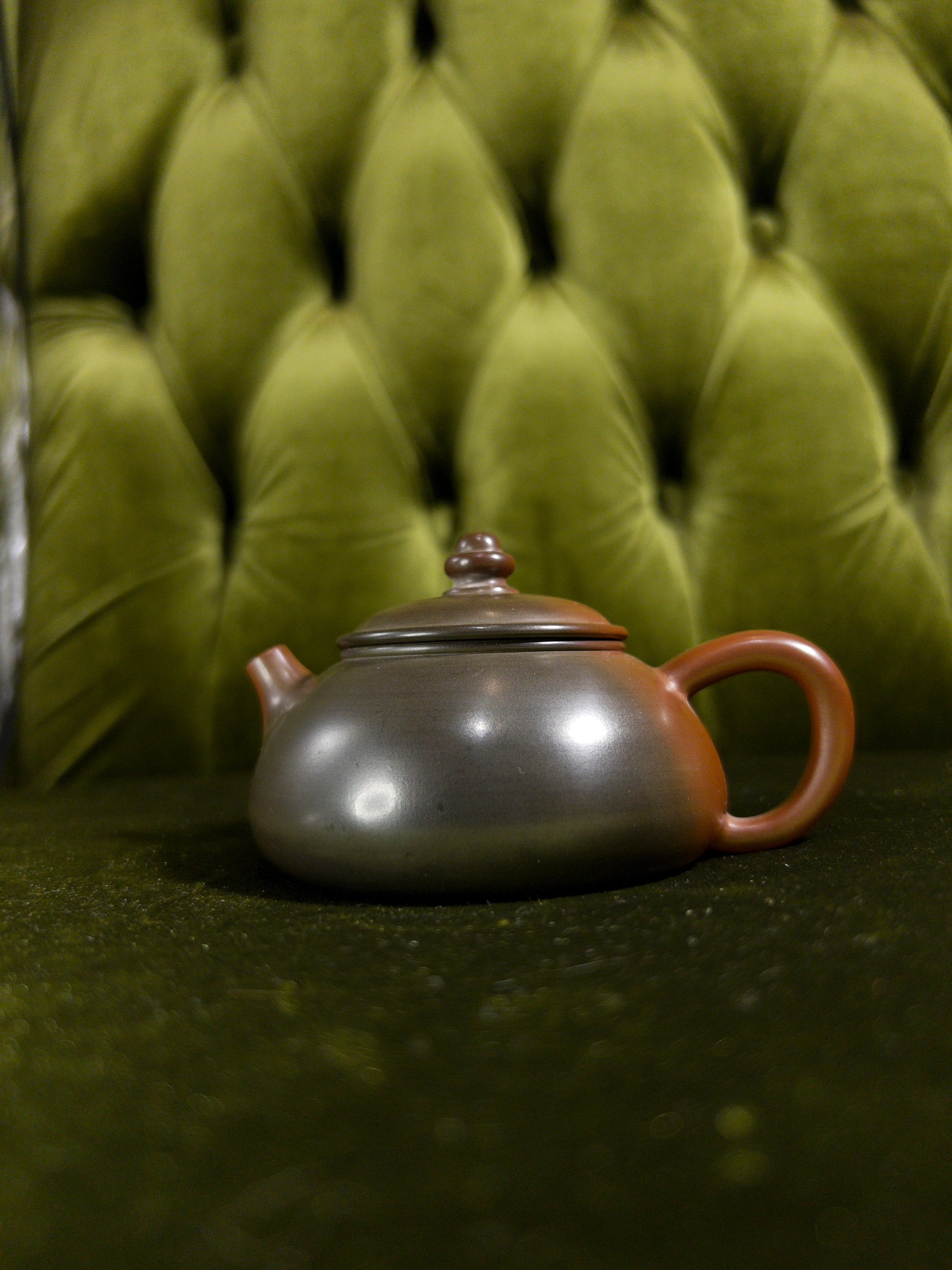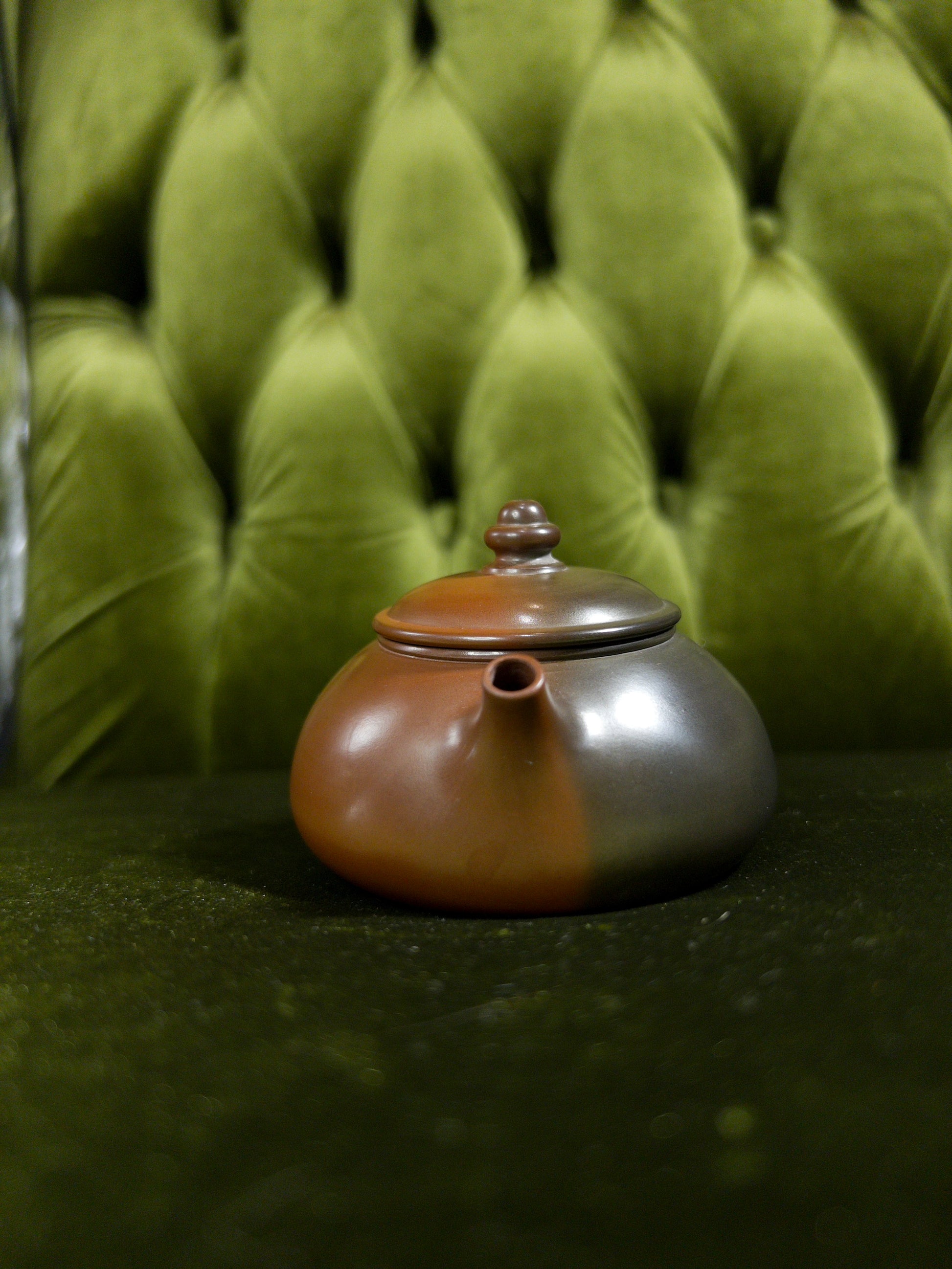 A small Yixing clay teapot with a smooth, rounded form and a subtle gradient — from smoky grey to warm amber. Its size invites stillness and precision, ideal for solo sessions or focused tastings. The soft sheen of the clay evokes both dusk and ember — a vessel of quiet intensity.