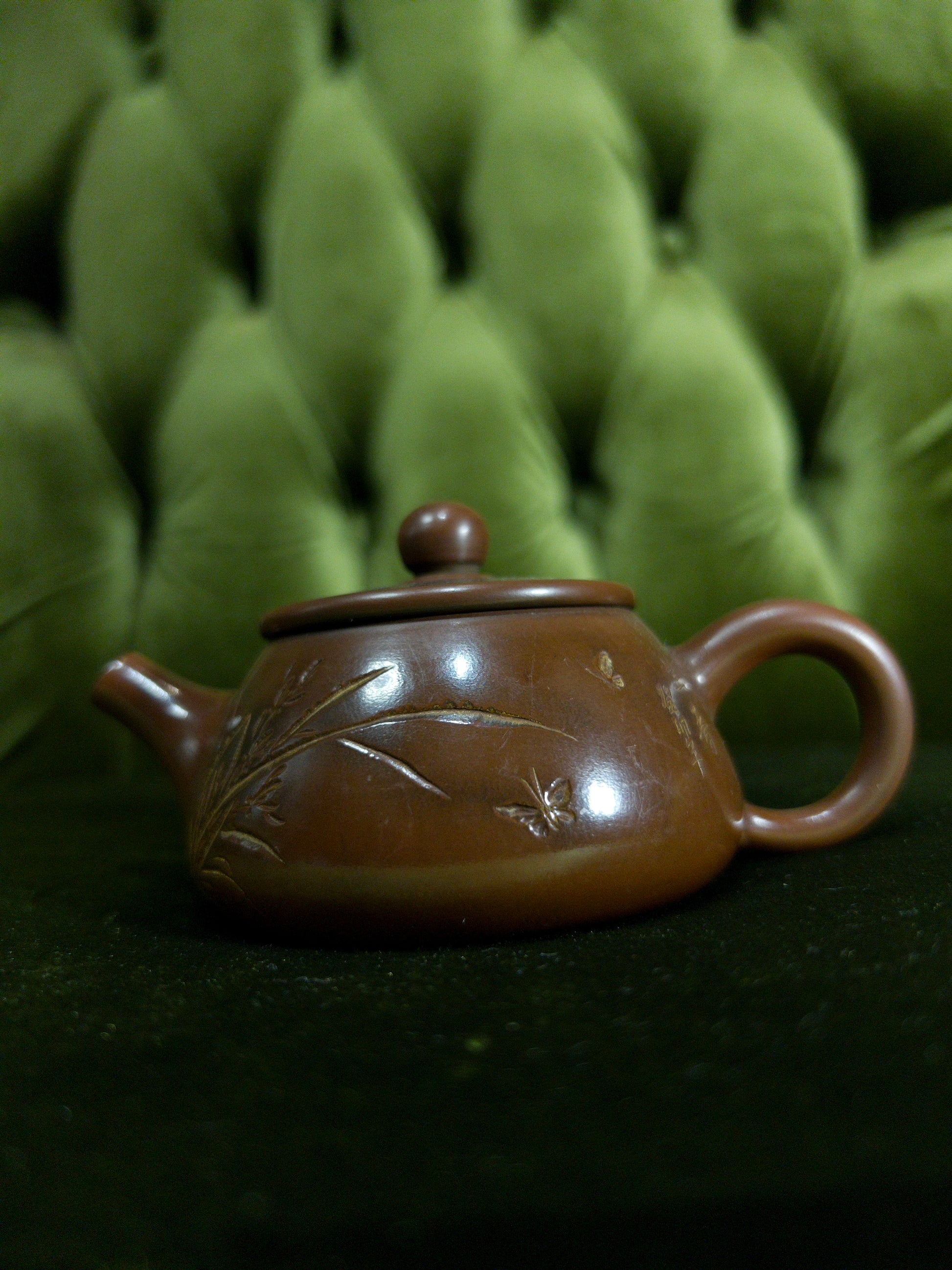 Bamboo Stillness is a rounded Yixing teapot with delicate engravings of bamboo branches and a butterfly in flight — a scene of quiet harmony. The form fits perfectly in the hand and keeps heat steady for smooth brews. Especially ideal for oolongs and red teas.