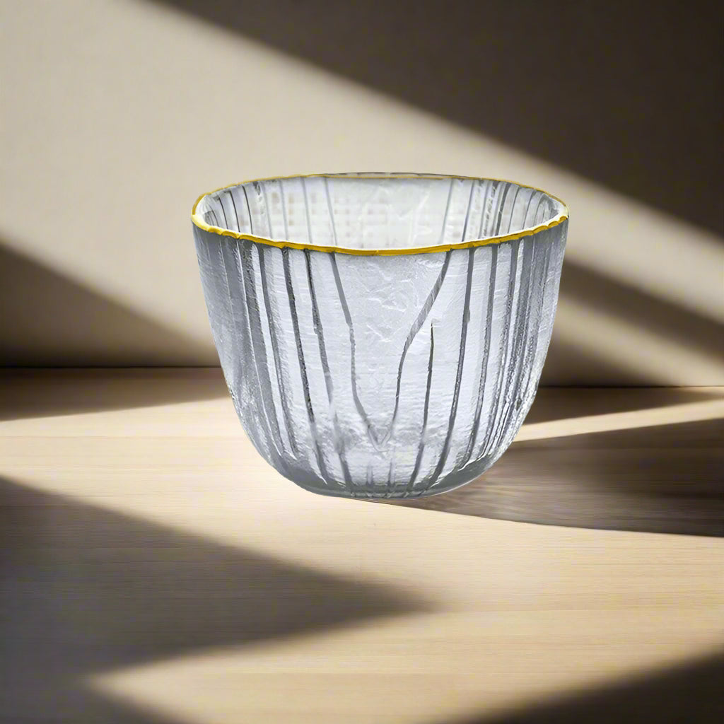 This elegant glass tea cup features a frosted, vertical-cracked texture reminiscent of frozen water, paired with an irregular golden rim that catches the light like sunlight on ice. The shape is rounded yet subtly organic, making it both functional and sculptural.