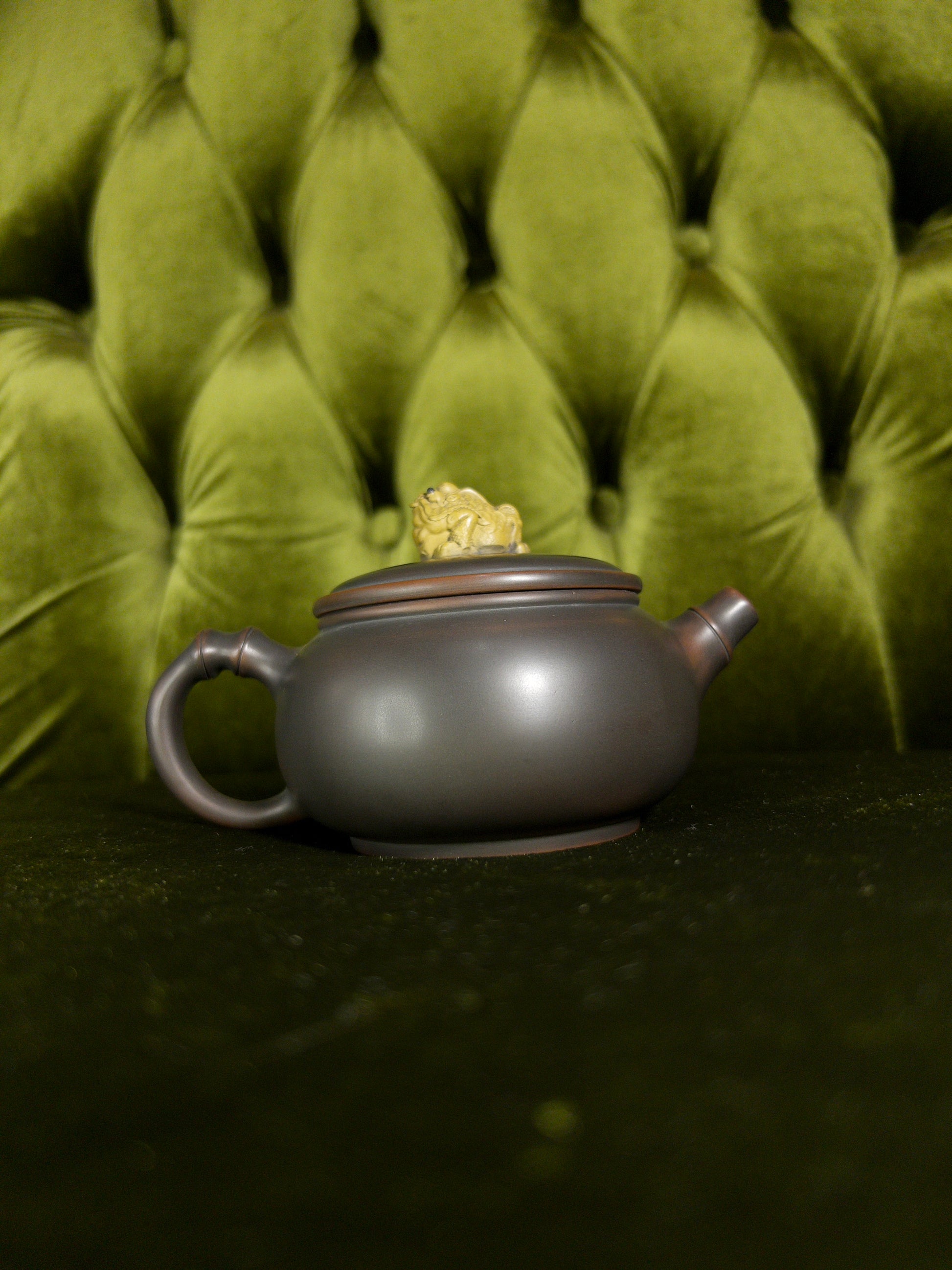 Kiln-fired from fine Yixing clay, this 200 ml teapot blends classical shape with a whimsical twist — a carved dragon knob crowning the lid like an imperial seal. The surface carries the soft sheen of traditional zisha, while the form offers excellent balance and a clean, stable pour. Perfect for those who enjoy tea with presence and personality.
