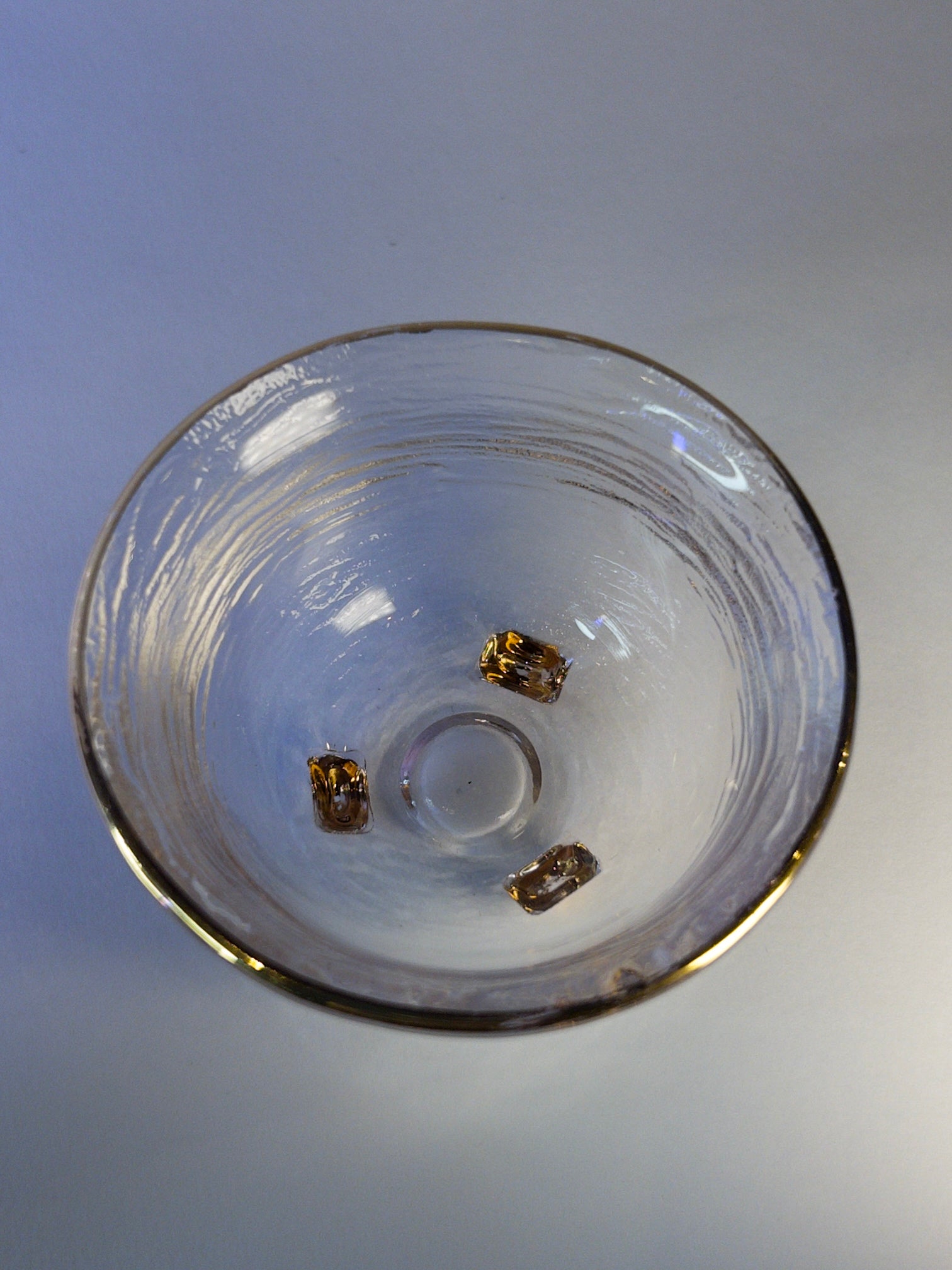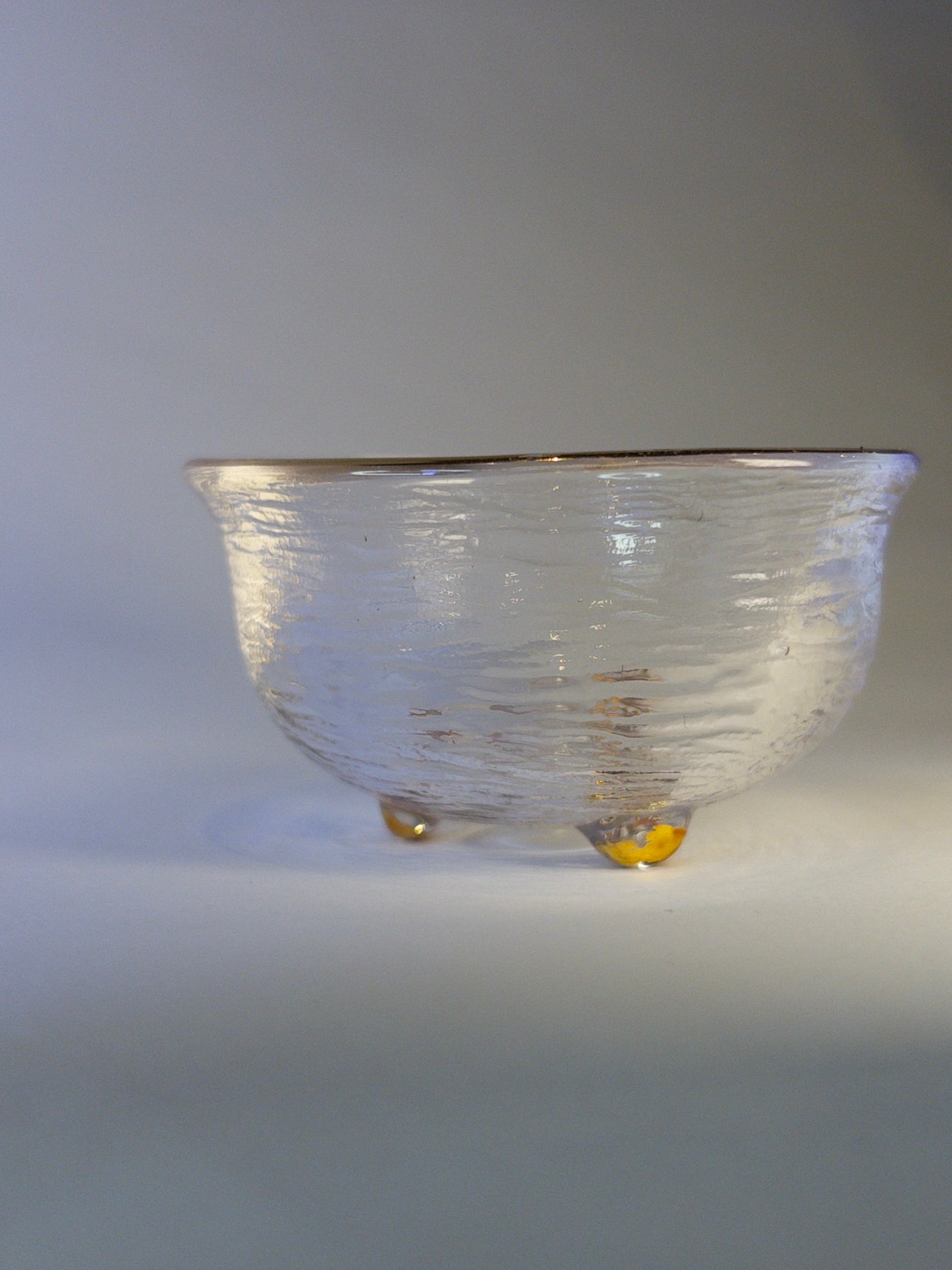 A luminous glass teacup balanced gracefully on three molten-glass feet, like droplets of morning light suspended in stillness. Its textured surface catches and bends reflections, while a fine golden rim traces the edge like a whispered breath.