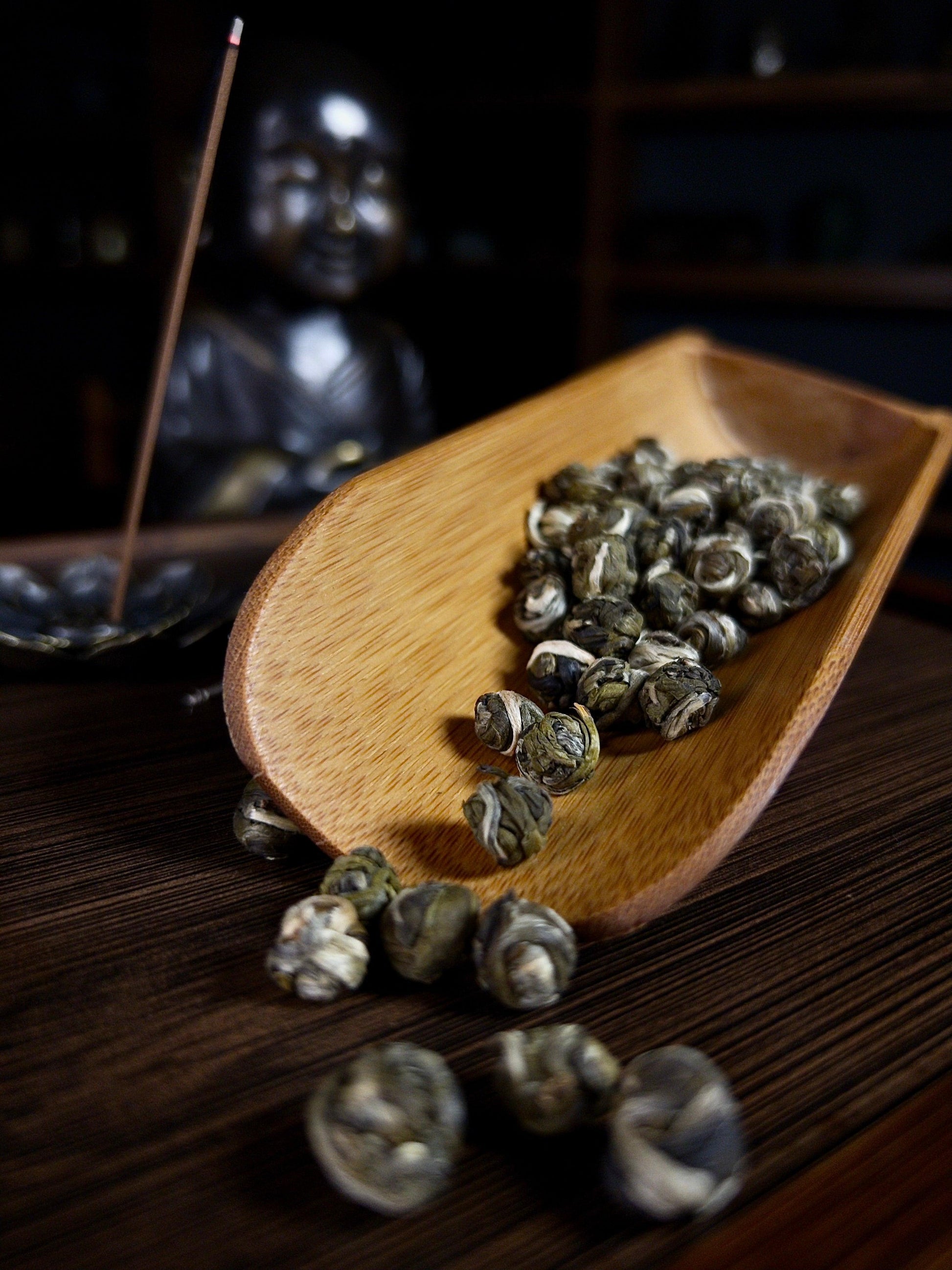Jasmine Dragon Pearl Tea is a luxurious Chinese green tea crafted from young spring leaves and jasmine blossoms. Each pearl is meticulously hand-rolled and naturally scented through a traditional multi-layer infusion process, where the tea absorbs the delicate fragrance of freshly bloomed jasmine flowers.