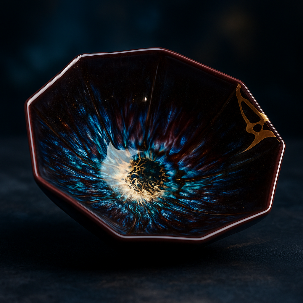 This bowl unites the cosmos and the philosophy of kintsugi — the Japanese art of “golden joinery,” where cracks are not hidden but honored. Gold-infused repair glows along the rim like a solar flare at the edge of a quiet universe. The center spirals outward like the birth of a galaxy — a radiant explosion frozen in ceramic.