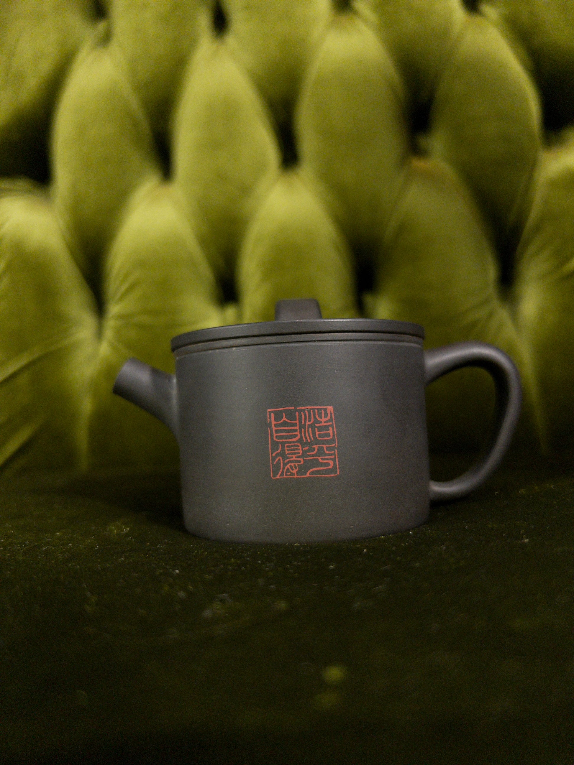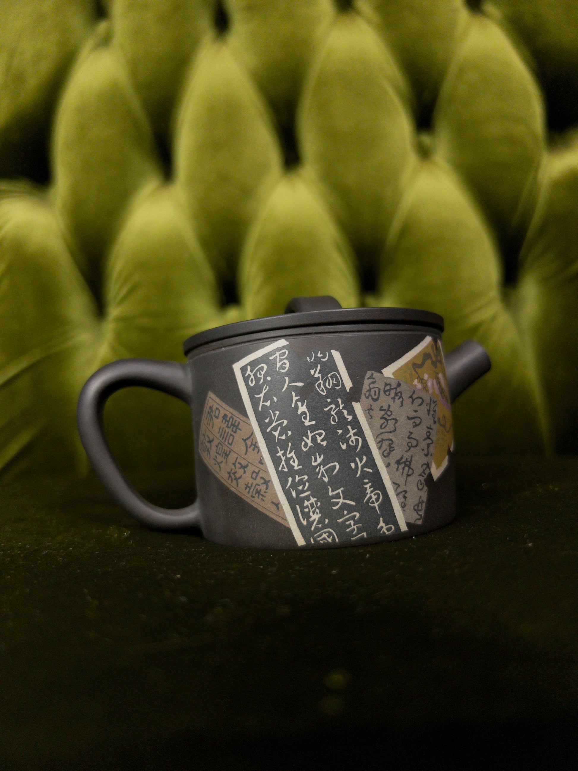 This Yixing-style black clay teapot is adorned with layered calligraphy and seal imprints, resembling a master’s personal scroll. Its textured inscriptions and smooth matte body evoke a sense of timeless message encrypted in clay. Inside, a built-in ceramic strainer offers ease of brewing, while its 140ml volume is perfect for oolong, sheng, or rare Taiwanese teas.