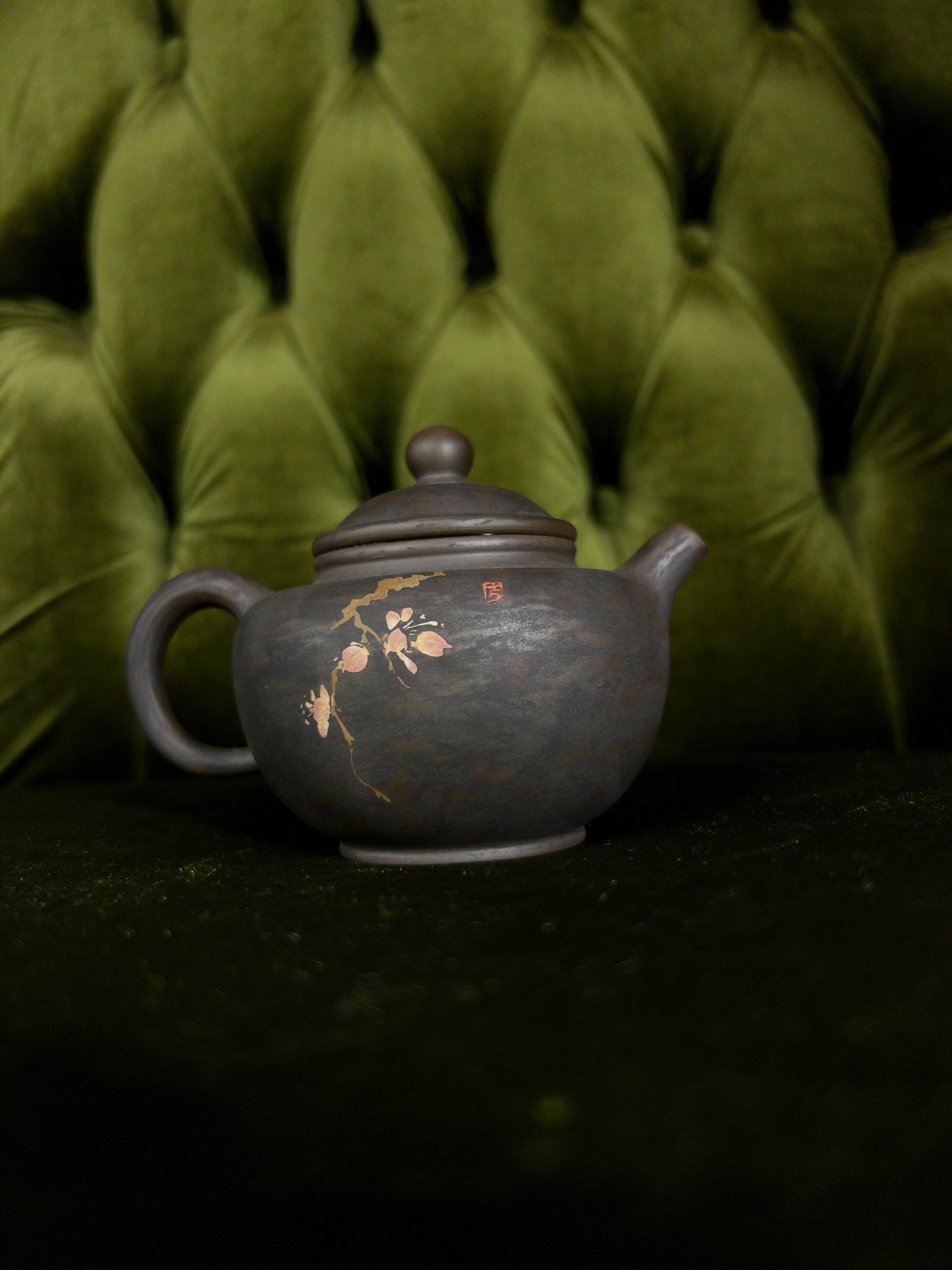 This teapot blends quiet elegance with total control. Crafted from Yixing clay with a soft matte texture reminiscent of dark stone, its hand-painted plum blossom branch evokes calmness and subtle beauty.