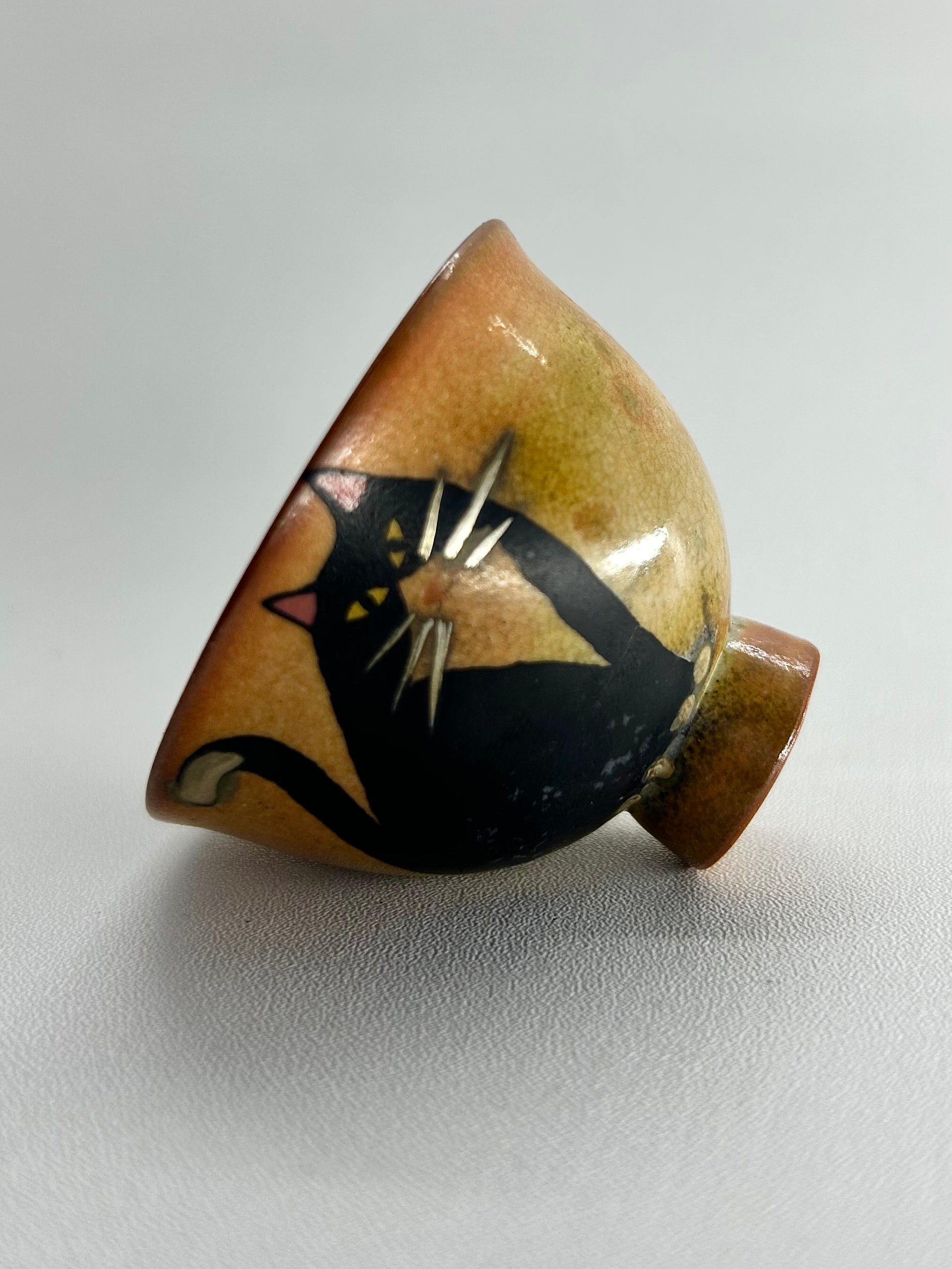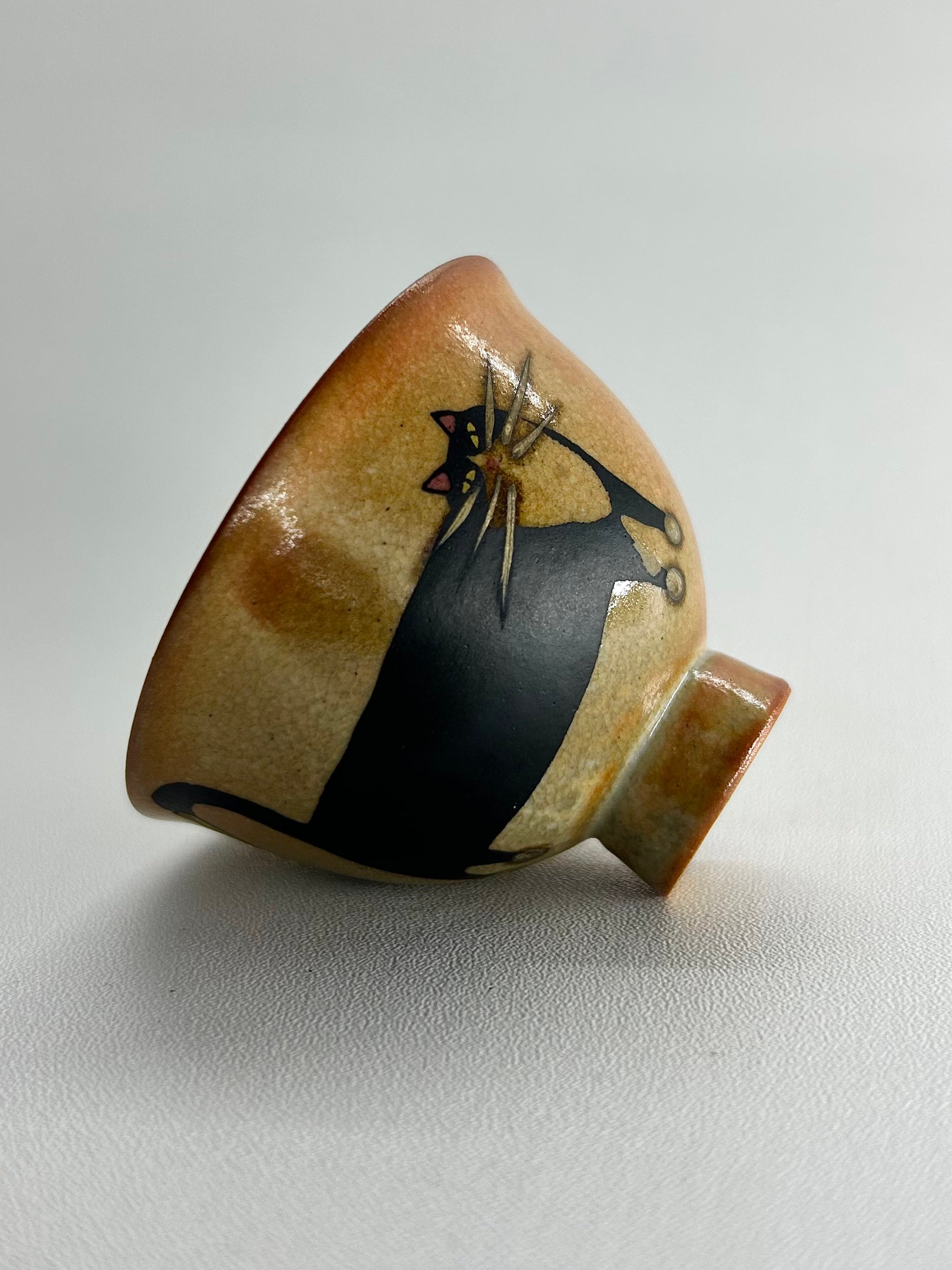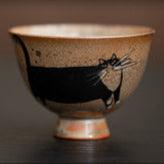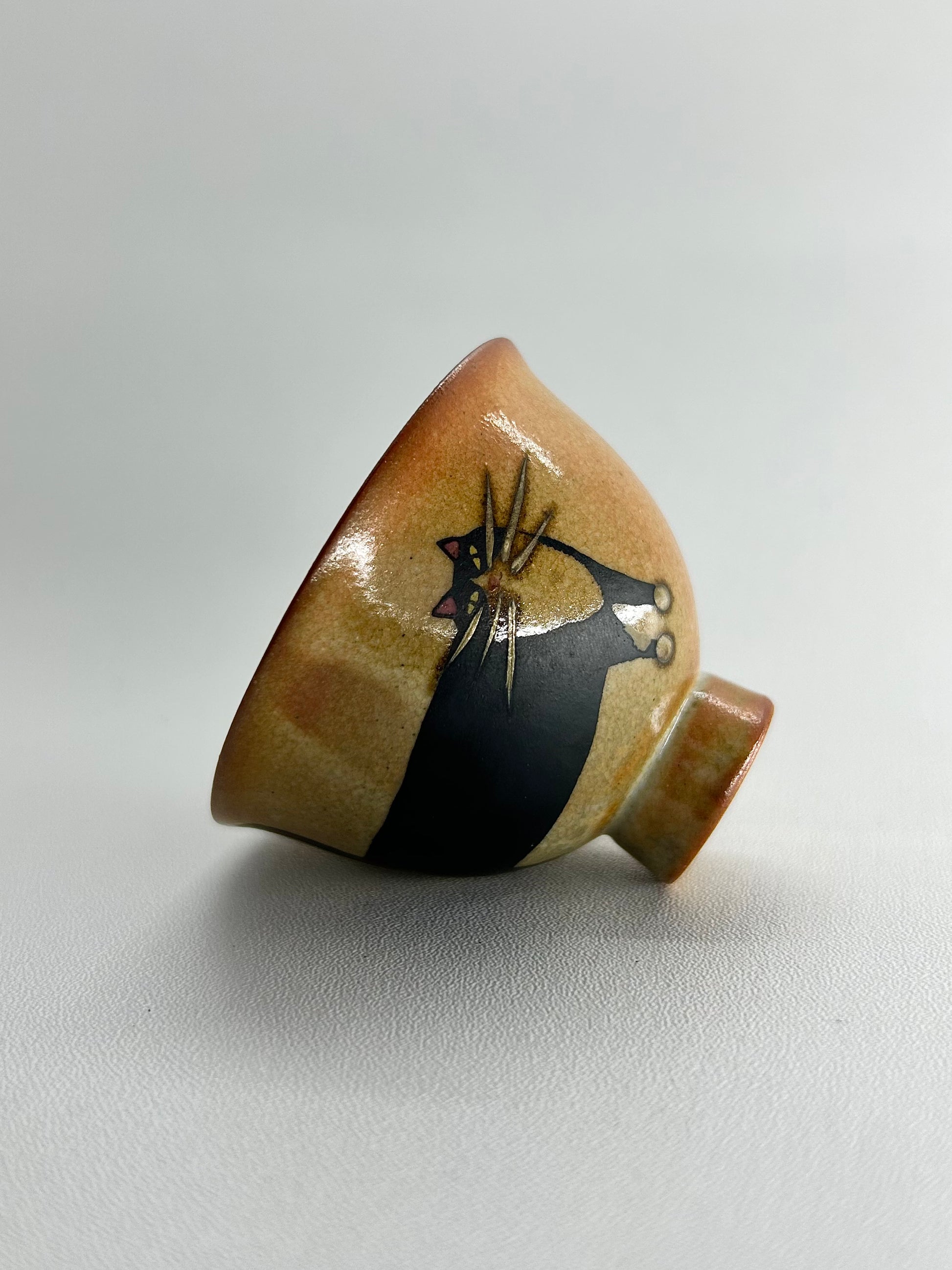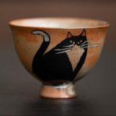 This Piala (tea cup) has a unique and charming design featuring silhouette of a black cat, set against a warm earthy brown and tan glaze. The minimalistic image of a cat with its graceful and mysterious figure gives the cup a playful yet elegant look. The natural hues of the glaze blend smoothly, giving the cup a rustic as well as a handcrafted feels. The overall aesthetic suggests a connection with nature and simplicity, while the cat motif evokes a sense of curiosity and warmth, making it perfect for casual tea moments with a whimsical twist.