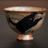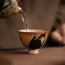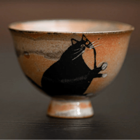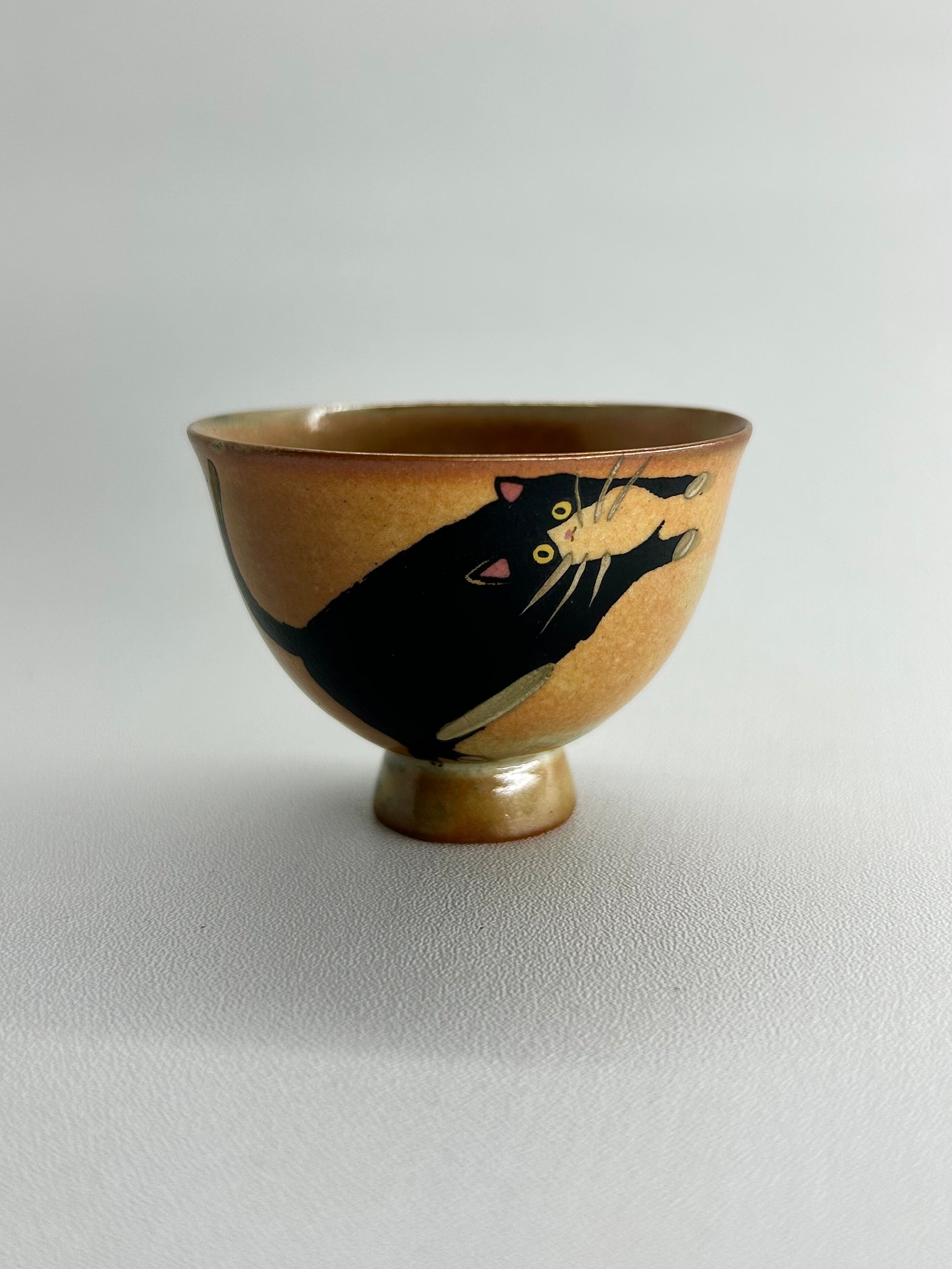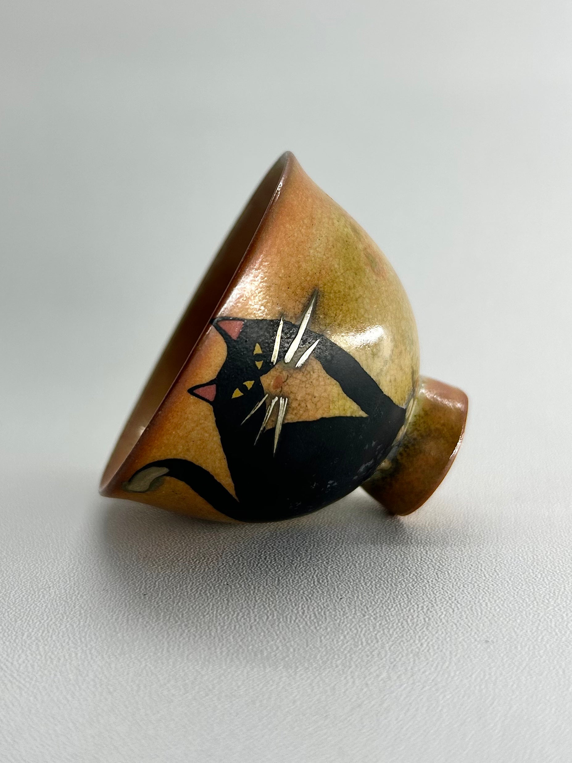 This Piala (tea cup) has a unique and charming design featuring silhouette of a black cat, set against a warm earthy brown and tan glaze. The minimalistic image of a cat with its graceful and mysterious figure gives the cup a playful yet elegant look. The natural hues of the glaze blend smoothly, giving the cup a rustic as well as a handcrafted feels. The overall aesthetic suggests a connection with nature and simplicity, while the cat motif evokes a sense of curiosity and warmth, making it perfect for casual tea moments with a whimsical twist.