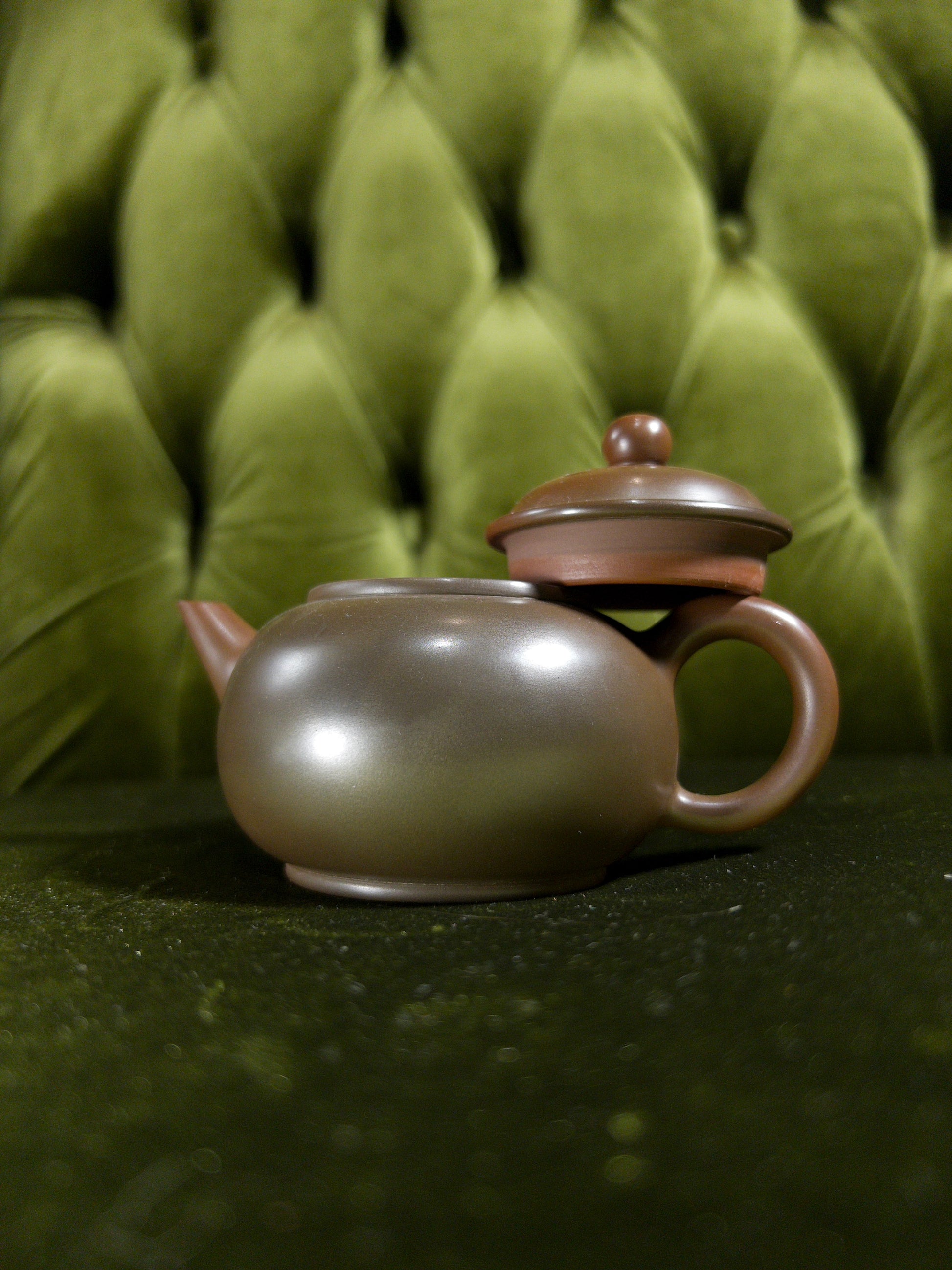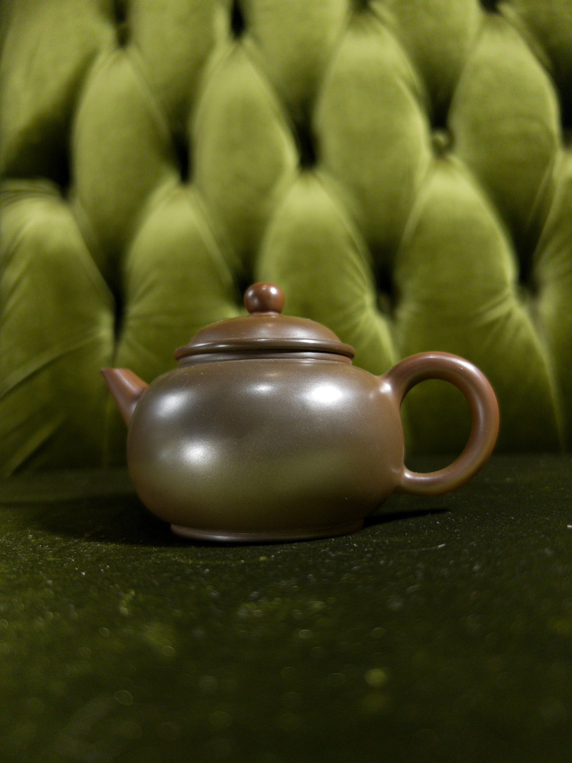 This 100 ml teapot, shaped like a softened ember, is the result of traditional wood-fired kiln craftsmanship. The body features a gradient patina of ash-burnished browns and smoky olives — a surface formed naturally in the fire. Its rounded form and small volume make it ideal for gongfu brewing of expressive teas like Dancong oolong, Wuyi yancha, or aged sheng puer.