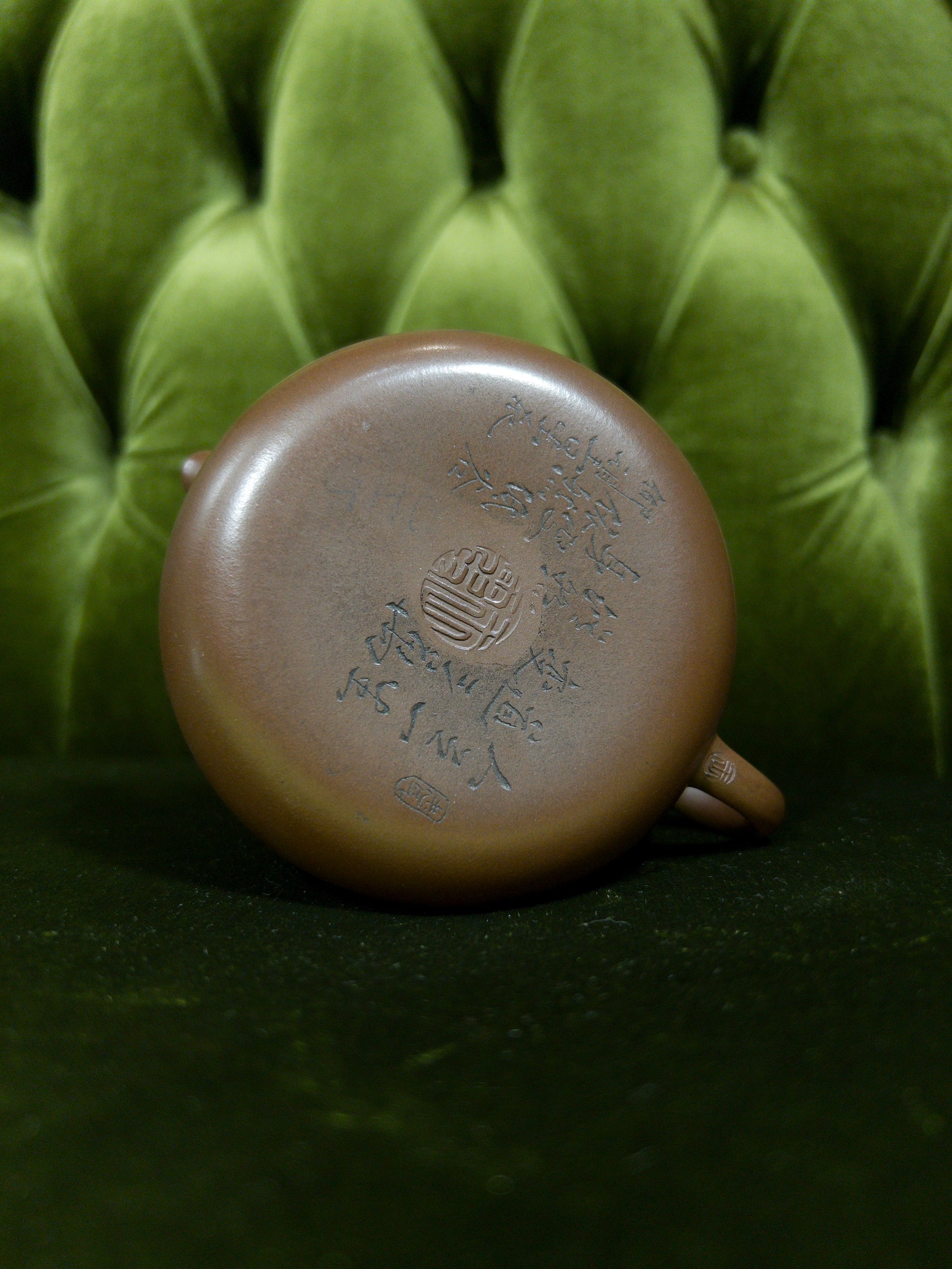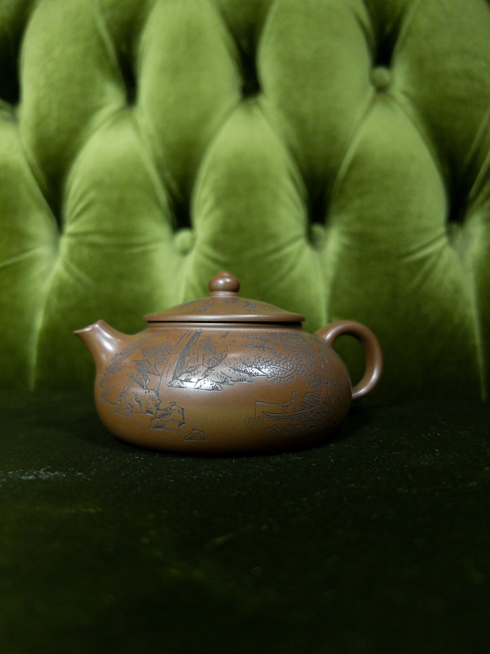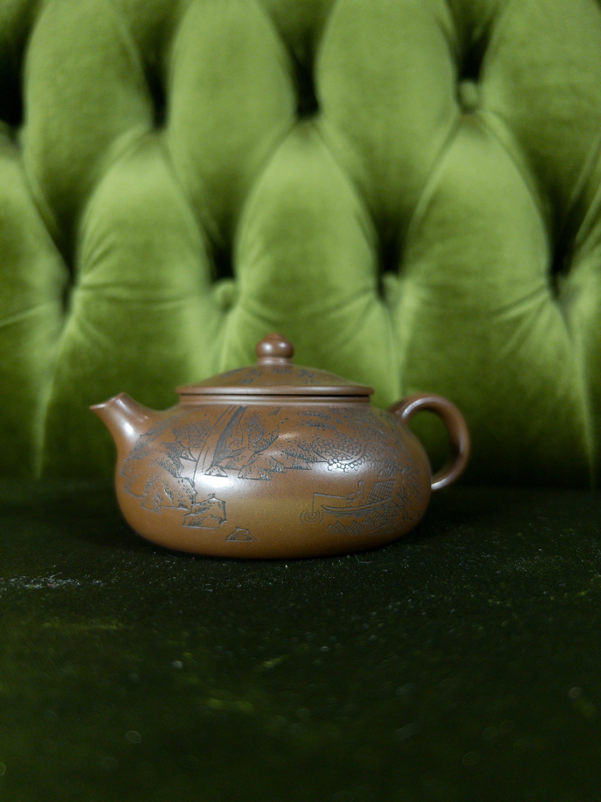 This hand-engraved teapot brings to life a tranquil moment — a fisherman drifting beneath pine trees, surrounded by still mountains. The thin-walled Zhuni clay body heats quickly and retains flavor beautifully, making it an excellent choice for contemplative tea sessions.